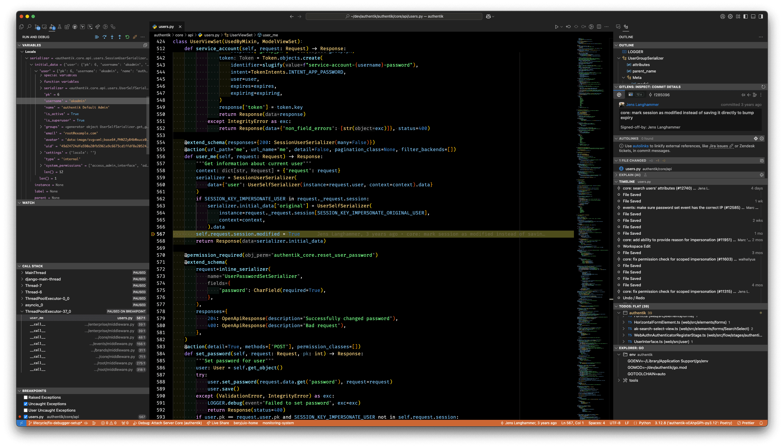 A local clone of the authentik repository is required to be able to set breakpoints in the code. The locally checked out repository must be on the same version/commit as the authentik version running in the containers. To checkout version 2024.12.3 for example, you can run git checkout version/2024.12.3.