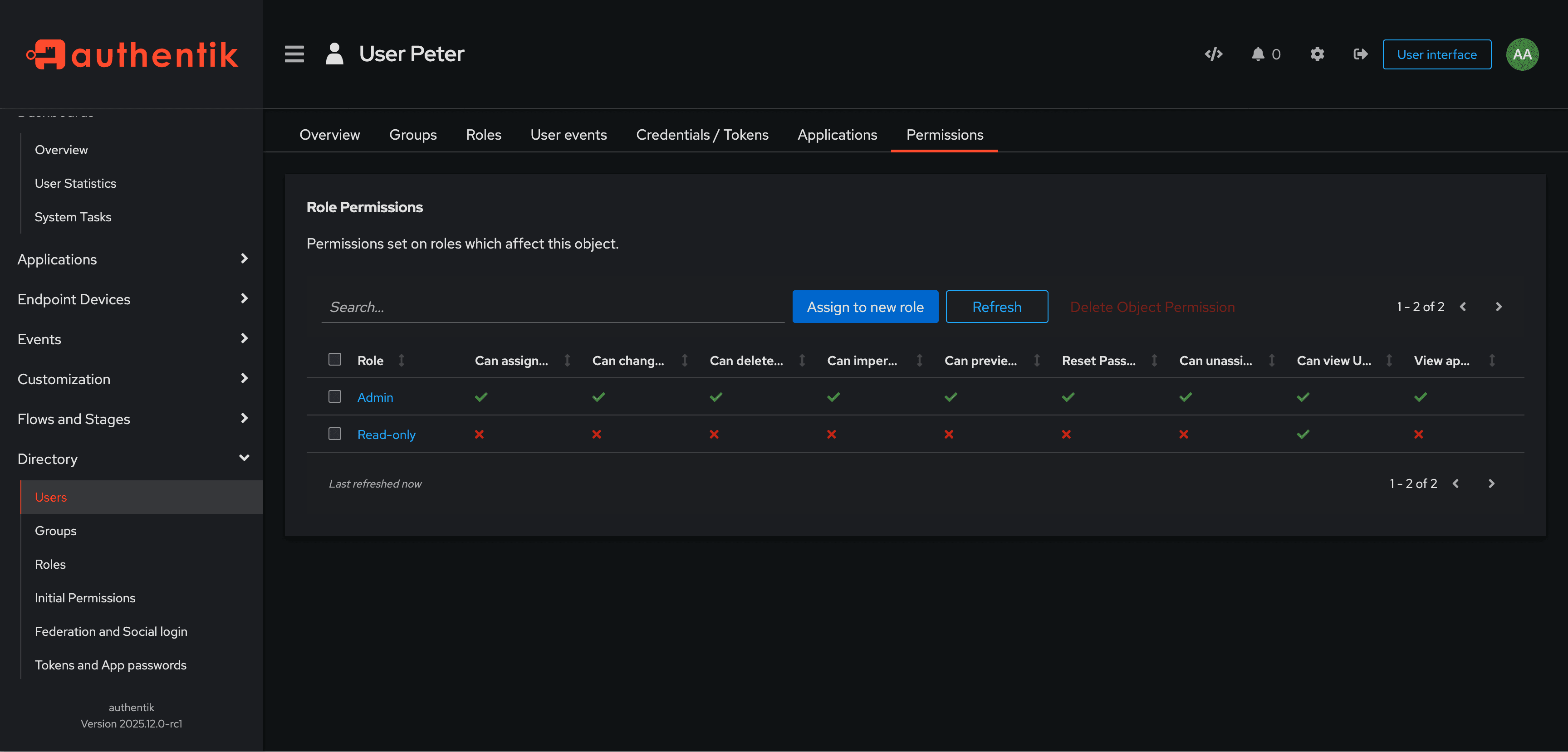 From 2025.12, authentik's access control is fully role-based. Before 2025.12, Admins could assign permissions to individual users. To mimic this behavior of "User permissions", an Admin can assign a user to role that has the required permissions.